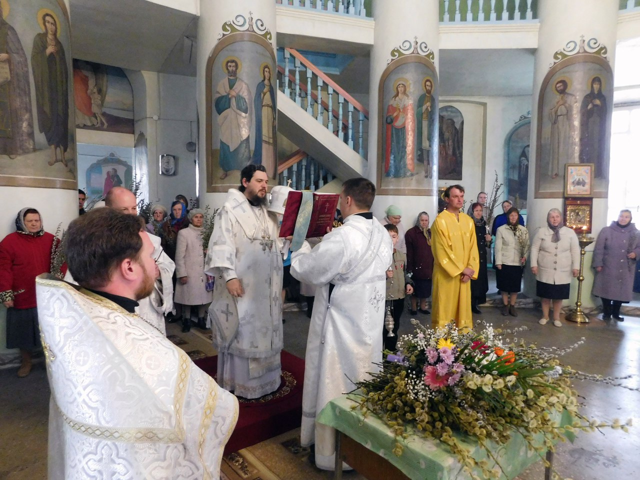 Богослужение возглавил Преосвященнейший Антоний, епископ Ахтубинский и Енотаевский. Архипастырю сослужили: настоятель прихода – иерей Сергий Черкасов, диакон Всеволод Гонцов. По традиции, в этот день были освящены ветви верб (ваий). После богослужения была отслужена Панихида по присно поминаемому рабу Божьему Георгию (Каширскому).